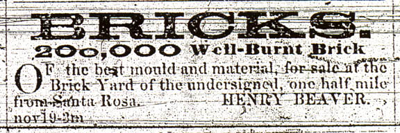 What ever the situation which had come about, it is indicated from the ad above, that Henry wanted to "change his occupation" and sale his farm at least by December of 1857. The street upon which Henry built his brick house and the property which James A. Cockrill had first settled in 1852, has since become known as Beaver Street, indelibly connecting Henry's name to Santa Rosa from that time on. Jeanne Miller was the last owner of Henry Beaver's House in Santa Rosa. It was knocked off its foundation by an earthquake in 1969 (as it was in 1857). Subsequently, it was razed rather then repaired, in keeping with the urban planning philosophy of the times, and one of the oldest and most unique buildings in Santa Rosa became replaced with some rather uninspired and insipid apartments.