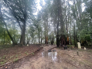Yesterday was absolutely miserable at the cemetery. Recent rains were supposed to have subsided by our workday start time, but we arrived to continuing rain and a very sodden cemetery. There were lakes in the paths, mud everywhere, and huge strips of eucalyptus littering the cemetery floor. Debris was completely water ladden, and heavy to haul off. Under most unpleasant working conditions, five of us toiled on through the discomfort and managed to fill our dump truck. Although conditions were tough, our little band was able to clear most of the paths, pulled much of the invasive thistle off the southern border, and dragged off the downed limbs caused by recent atmospheric rivers. As we left (last picture), blue skies peaked out from the clouds, and the cemetery was back to its usual picturesque self.