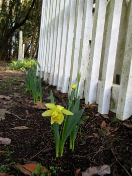Dear Friends of Spring Hill Cemetery, Nine of us gathered at the cemetery this morning for our first workday of 2012. Although the winter has been mild, debris littered the paths and monuments. We had our work cut out for us. Additionally, it was a thrill to see the newly returned headstone for Wm. Kelley (first attached picture, and it is also in the foreground of the group shot), which was discovered by Brad DaVall last month. The skies were clear, and we had a successful workday. Spring is beginning to arrive at Spring Hill. The naked lady bulbs are sprouting leaves, as are the lilies of the valley; and the Luther Burbank daffodils are already starting to bloom. The second attachment shows the daffs alongside the Zilhart enclosure, looking towards "McReynolds row." Butterflies joined us - and we even had a large wild turkey run across the cemetery while we worked. It was absolutely delightful. As mentioned, the cemetery was filled with debris - downed tree limbs, eucalyptus bark, and leaves - obscuring paths and monuments. We had so much debris, that our dump truck was overflowing by 11:30, forcing us to stop a bit early. The third and the fifth attachment show us filling the truck, and hauling off the debris. The cemetery was left looking serene, paths raked, and monuments uncovered. I have included William D Kelley's newspaper obit, O'leary funeral home information, and information on the log-style headstone at the end of this email. William's wife, Mabel, is also interred at Spring Hill, and, although we think we have found her base alongside her husband, her stone is missing. Thanks to all of you who were able to join in our efforts this month. Our next workday is scheduled for Friday, March 16th. Please come join us if you can. Best Regards, Sue