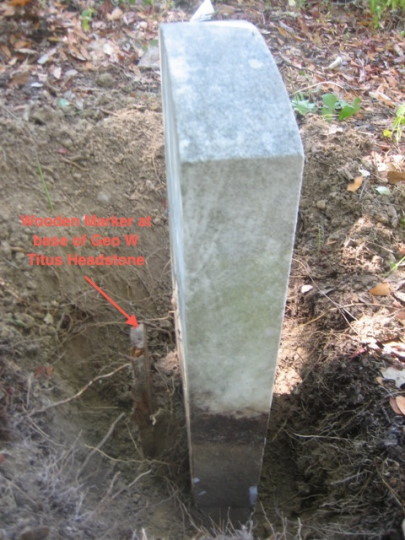 Dear Friends of Spring Hill Cemetery, We had a sturdy crew of 10 for our workday on Friday. It was probably our warmest workday yet, but with Spring Hill's shade and cool breezes, we had pleasant conditions for our very productive day. Larry Robertson and his grandson, Josh, from Mokelumne Hill, were welcome additions to our base resetting crew, as a couple of our regulars on this task were unable to make it this month. 5 additional bases (Geo Titus, Samuel/Emma McReynolds, Benjamin Towner, James McReynolds) were reset. We have now reset well over half of the cemetery's headstone bases, and are ready for more input from Gary Galeazzi of North Bay Monument on how to proceed with securing the stones into the reset bases (Jeremy talked with Gary, and Gary thinks he will be able to help us with that in October). We continued with discoveries, and filled the small dump truck with gathered debris. Many thanks to Regional Parks for supporting us with tools, dump truck and cool drinks; to our ever supportive neighbors to the south (the McDowells) for the parking spaces and use of water - and to the volunteers who lent their labor. We have made several discoveries over the past few months while resetting Spring Hills’ bases and stones, ranging from "the message in a bottle" to previously buried footstones and monument fragments. This months’ resetting surprises came while digging out, leveling, and resetting George W Titus’ military headstone. In the process of removing the stone, we came across a buried unmarked wooden marker next to his stone (first picture attached). An even more intriguing aspect of George’s site, once the monument was removed, was the stone itself. Both the wooden marker and the peculiarities of the stone tie in with a 5 April 1910 Santa Rosa Republican article Ray Owen sent me recently titled, “Monuments for Old War Veterans Have Arrived.” Ray’s accompanying letter to me articulately supplies background: From a review of the newspaper between December 1908 and August 1910, I noticed several articles that reported the receipt of government-issue headstones for veterans buried in Sonoma County. The concerted effort was lead by Dr. Franklin Elijah Brower, a past commander of Ellsworth Post of the G.A.R. of Santa Rosa. The G.A.R. was the Grand Army of the Republic, a national organization of Union veterans of the Civil War. Some wags asserted that “G.A.R.” really stood for “Generally All Republicans” – a largely accurate observation. In April 1910, a list of headstones recently received was published and included that of “Geo. W. Titus, private Co. I, 4th Mich. Cav., died March 24, 1909, Spring Hill Cemetery, civil war veteran.” Thus, the military headstone for George W. Titus, buried in Spring Hill Cemetery, was secured and placed under the direction of Ellsworth Post, G.A.R, Santa Rosa, CA. An excerpt from the 5 April 1910 article: "Dr. F. E. Brower of this city, the army vereran has received from the Quartermaster's Department, twenty-one tombstones to be erected over the graves of the war heroes." The article goes on to list details of the arriving stones. Besides the stone destined for Spring Hill, other cemeteries receiving the stones were Sebastopol cemetery, Fulkerson cemetery, IOOF cemetery, Rural cemetery, Calvary cemetery, Guerneville cemetery, and Shiloh cemetery. Most were stones for civil war vets, but there were also several from the Spanish-American war, and one Mexican war veteran. The plain wooden marker we found obviously marked the spot of George’s grave until his military headstone arrived. The surprise of the stone was that it had two inscriptions – the correct inscription on the visible end of the stone, and nearly the same inscription on the buried other side and end of the stone with “INF” instead of the correct “CAV.” (3rd picture attached). Ray didn’t mention where the government-issue headstones were carved (stones sent with inscriptions already on them, or stones sent and then carved locally), but apparently, the carving on George’s was incorrect, the error caught, and the solution decided on was to reuse the other end of the stone. As my husband pointed out to me, white-out unfortunately doesn’t work on stone. This George W. Titus is one of two George W. Titus’ buried at Spring Hill – the two Georges were first cousins. There are 13 interrelated Titus/Ward/Marsh family burials at Spring Hill, ranging in burial dates from 1875 with the burial of William H Ward to the most recent 1942 burial of Embert Milo Titus. The last attachment is a chart showing the various Titus/Ward/Marsh connections. On the heels of his successful uncovering of Mary Catherine Small's foot stone last month, Dick continued his discovery streak by finding a part of a stone near a large un-topped base (the 4th attachment). There was no visible writing on the stone. We will try matching it with the other incomplete fragments we have found in an attempt to further identify it. It may have been part of a monument grouping such as the Ward grouping visible in the 4th attachment above the fragment. The Ward grouping consists of a large central monument carved with details of four Ward burials recorded on it, and smaller individual head and foot stones surrounding it. Unfortunately, if this was a grouping such as the Ward grouping, the large central monument is no longer in the cemetery. But we may be able to find additional peripheral stones to aide in identification. I have a correction to last month's recap. In it I mentioned we had found another piece of James L Parmeter's headstone and that his mother, Lavinia Robertson Parmeter, was to the south of James and his father, Jefferson D Parmeter was to the south of Lavinia. The correction is that Jefferson D Parmeter was James L Parmeter's brother (not father). James L and Jefferson's father was John Spencer Parmeter. Following the workday, about a dozen of the "Friends" met with Sono