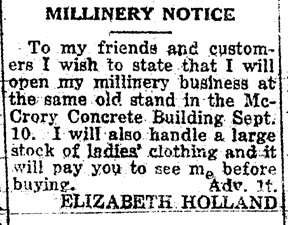 My "Aunt Elizabeth" had a millinery shop in the mezzanine of Planters Mercantile in McCrory, AR in the 1920's. The above ad in a 1918 issue of the McCrory weekly newspaper, the Central Leader, suggests that the shop may have originally been in a different building as well as being a continuation of the business which her mother once maintained (indicated in the 1910 Census and of which there is no family remembrance). |