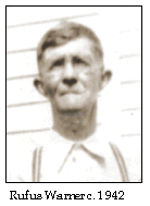 It appears that he had little contact with his father or other Warner family members until late in life. There apears to be no other Warner pictures in Cora's collection except for a early picture his half brother, Luther Loyd Warner, and a later picture of Guy Willard ("Buddy") Warner. It is not clear if these pictures were actually given to Rufus or originally obtain by Rufus's son, my grandfather, instead.